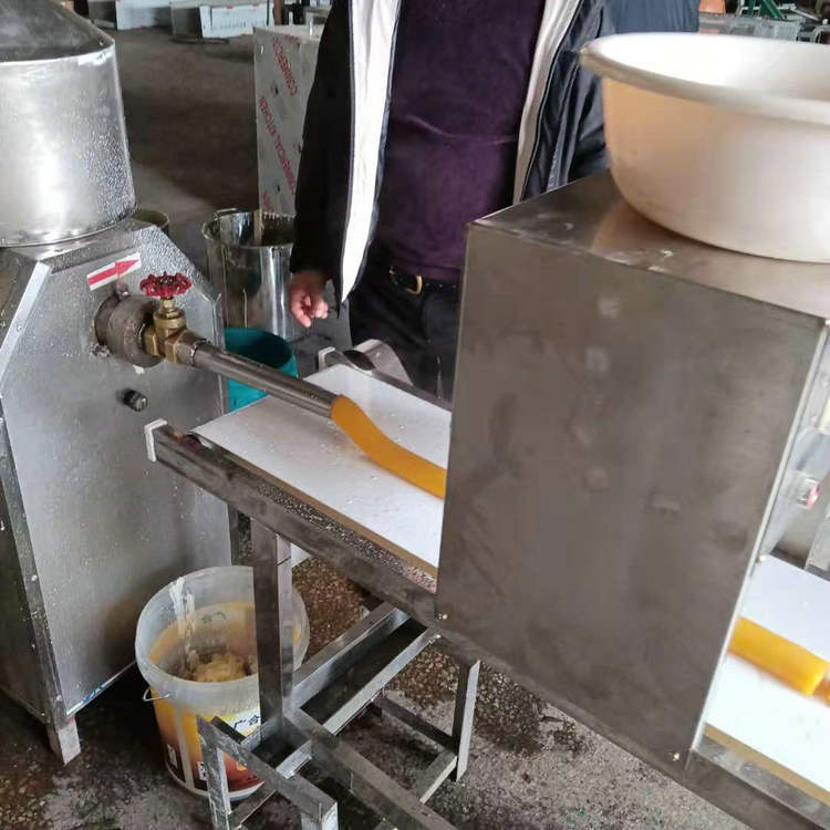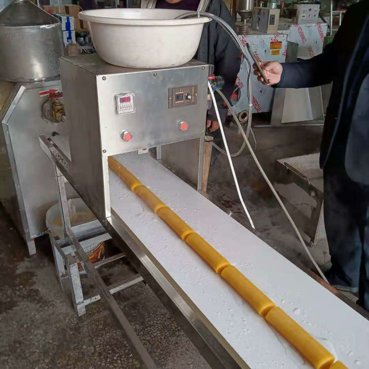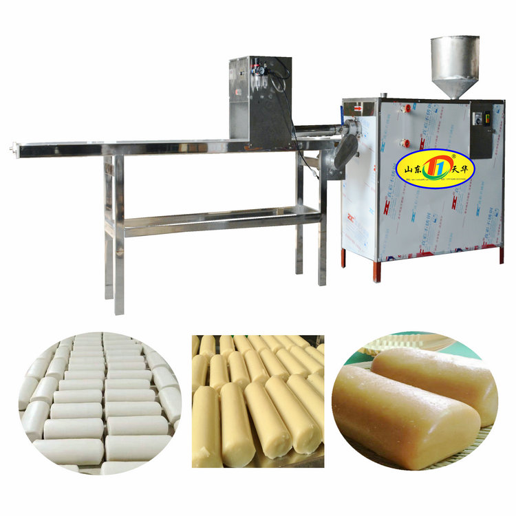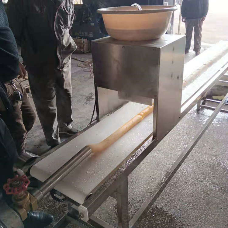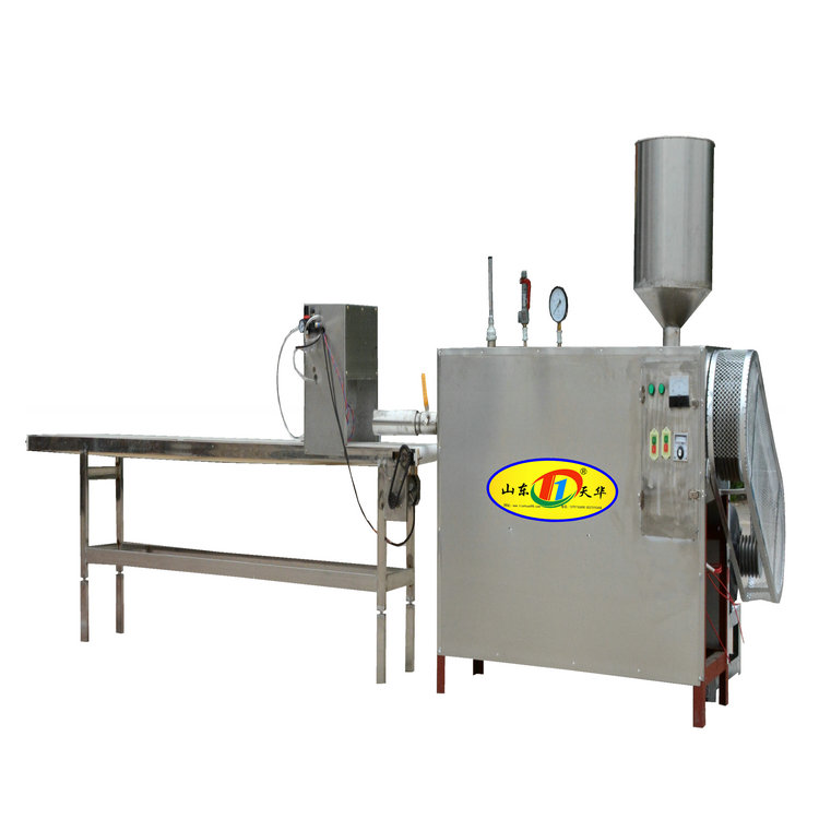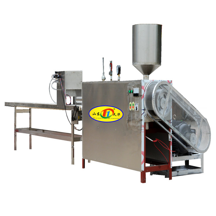 玉米粑粑機(jī)由電熱溫控裝置、水浴蒸箱、螺桿揉壓勻質(zhì)擠出裝置、成型模頭和數(shù)控切斷機(jī)組成,螺桿揉壓勻質(zhì)擠出裝置外面由水浴蒸箱包圍,蒸箱內(nèi)注有水,通過電熱溫控把水燒開,蒸煮通過螺桿的玉米漿,使之熟化,并推揉勻質(zhì),經(jīng)模具定型擠出而成。其配套的切斷機(jī)可以通過延時(shí)控制器調(diào)整切斷的長短。該機(jī)也可以用米漿加工年糕、米豆腐、堿粑等,還可以用木薯淀粉和玉米淀粉加工蝦片等。